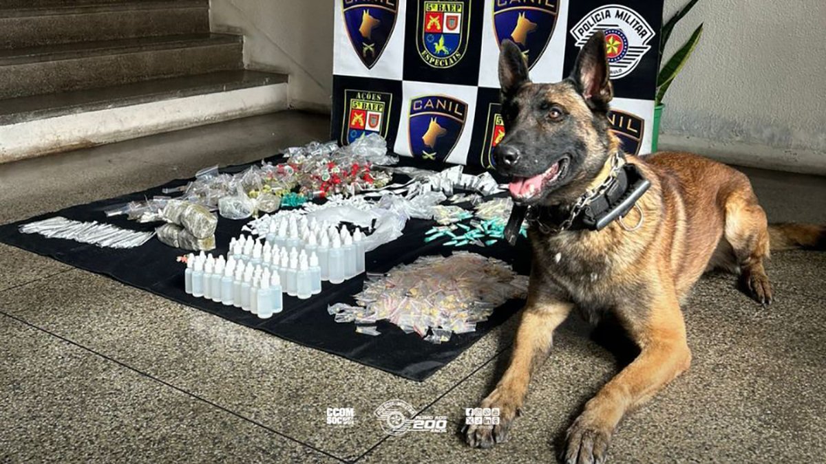 Segundo a Polícia Militar, o cão farejador Thor apresentou alteração de comportamento ao passar por um terreno baldio. A equipe realizou uma varredura no local e encontrou drogas escondidas sob entulhos de construção.