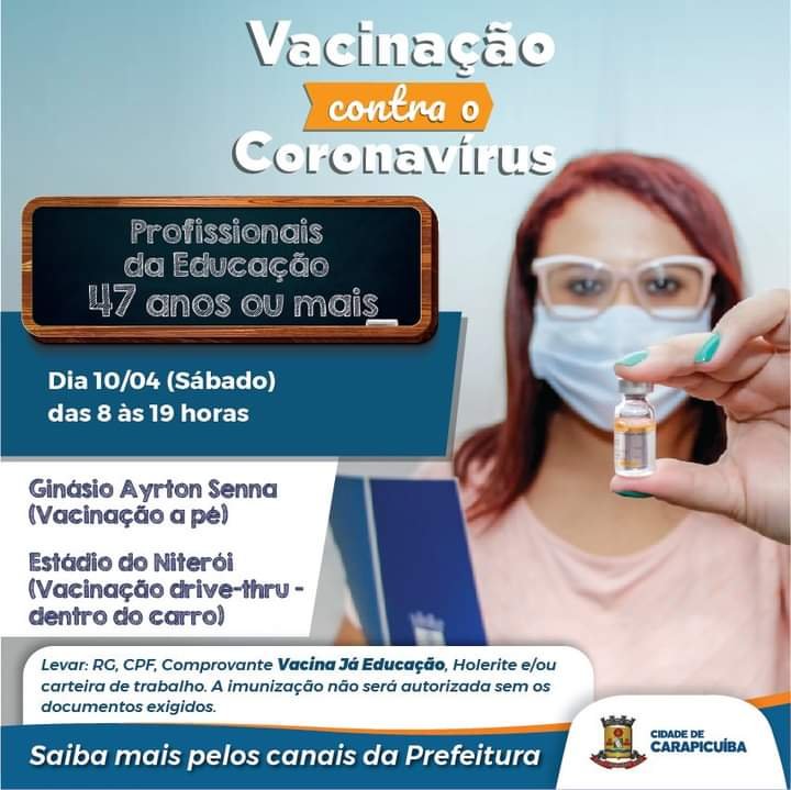 A vacinação de profissionais da educação com 47 anos ou mais se inicia dia 10 (sábado). Serão contemplados na primeira fase aqueles que atuam na rede municipal, estadual, federal e privada de ensino, desde a educação infantil até o Ensino Médio.