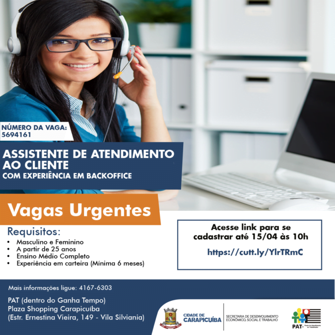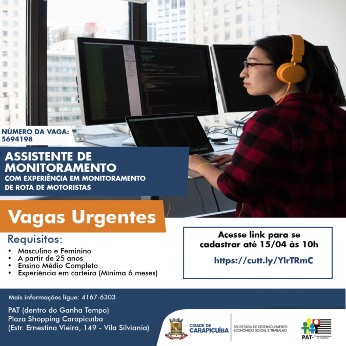 O PAT Carapicuíba tem vagas para Assistente de atendimento ao cliente e Assistente de monitoramento.
