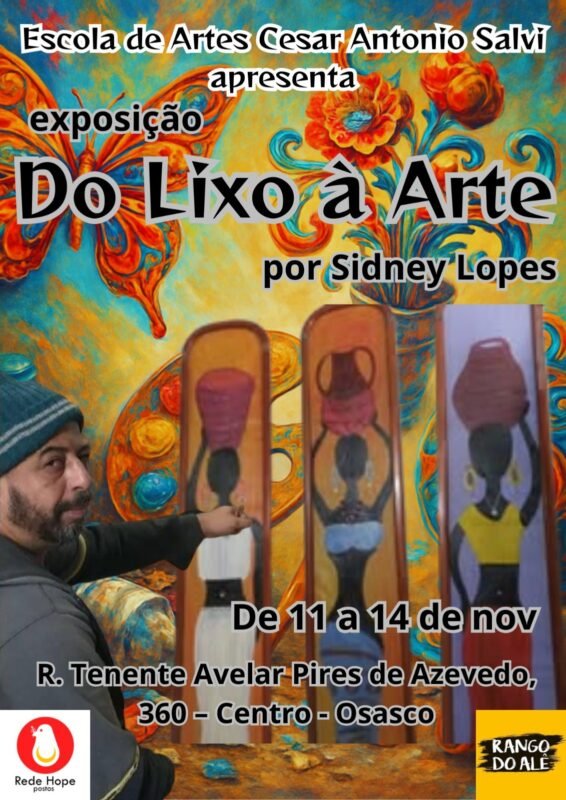 De 11 a 14 de novembro, a Escola de Artes, César Antonio Salvi, recebe a exposição “Do Lixo à Arte”, que reúne obras produzidas a partir de materiais recicláveis e sucatas — tudo o que, aos olhos do artista, ainda guarda beleza e significado. A abertura contará com coquetel de lançamento no dia 11, reunindo admiradores e parceiros que acompanham a trajetória de Sapão há anos.
