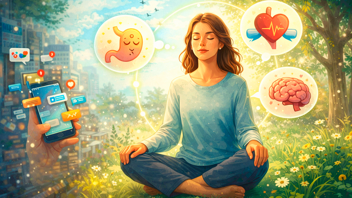 Desconectados. É curioso: estamos ligados o tempo todo, o celular virou quase uma extensão do nosso corpo, mas, ao mesmo tempo, cada vez mais afastados do aqui e agora, da natureza e até de nós mesmos. Você coloca a roupa para lavar enquanto paga uma conta, fala com o filho no celular no meio do trânsito, responde um email do trabalho enquanto come. Faz tudo ao mesmo tempo, mas sem estar presente em nada. Talvez você nem lembre o que comeu no café da manhã, de tão automática que se tornou a rotina. Seguimos escolhendo sem ouvir o corpo.
