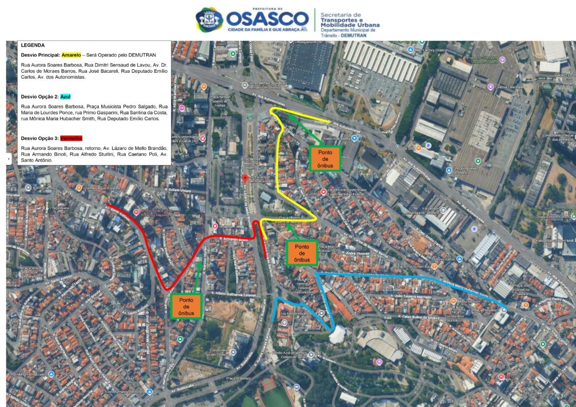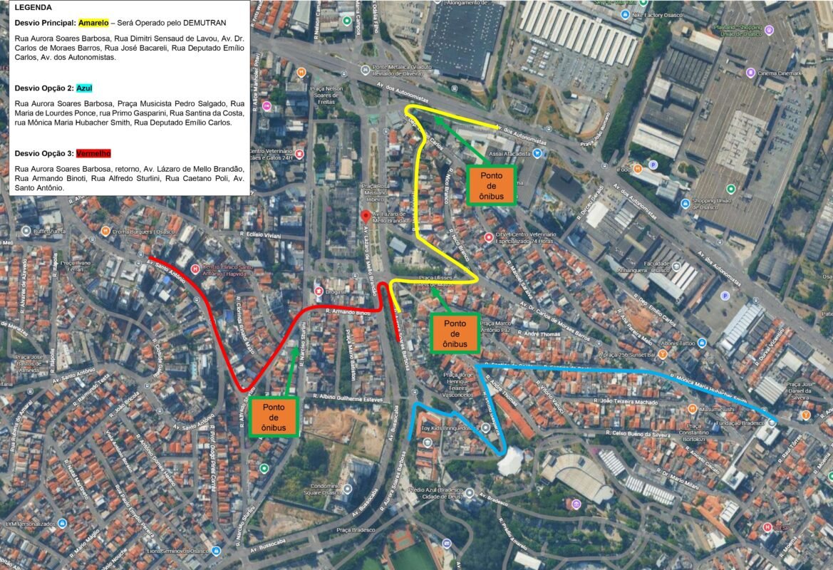 Motoristas que trafegam pela Rua Aurora Soares Barbosa (sentido Jardim D’Abril/Via Yara) devem seguir pela Rua Dimitri Sensaud de Lavoud, depois Avenida Dr. Carlos de Moraes Barros, passando pela Rua José Baccarelli e Rua Deputado Emílio Carlos, até chegar à Avenida dos Autonomistas.