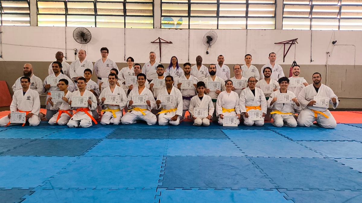 Durante o exame, os karatecas foram avaliados em kihon (fundamentos), kata (formas) e kumite (combate) por uma banca técnica altamente qualificada. A troca de faixa simboliza evolução, disciplina e aperfeiçoamento técnico dentro da arte marcial.