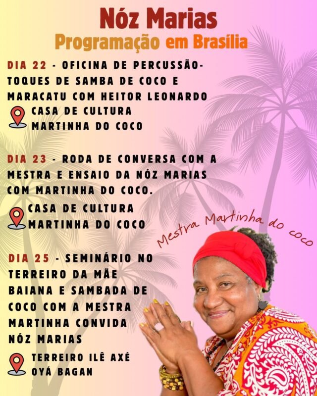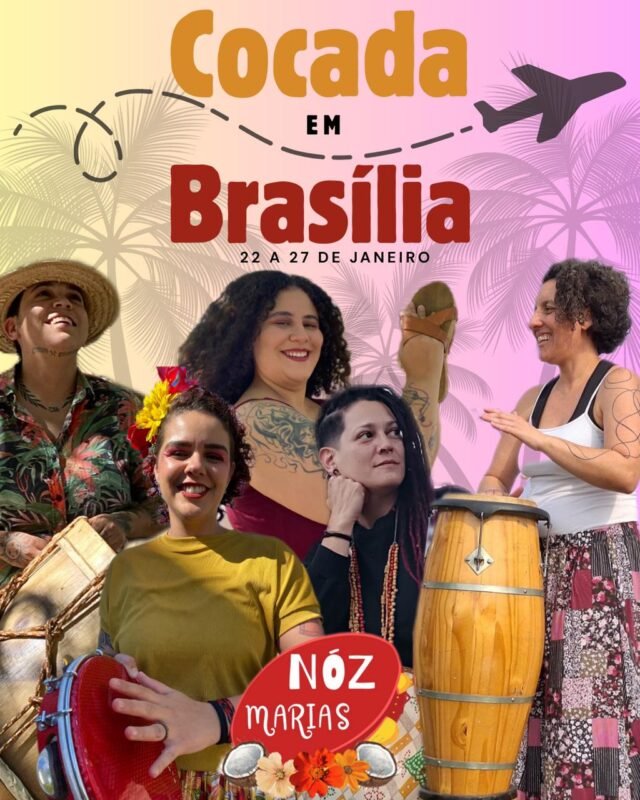 Enquanto faltam palcos na cidade, o grupo conquista convites fora dela. Nesta semana, as Nóz Marias atravessam fronteiras simbólicas e geográficas ao levarem sua arte para Brasília, onde participam de uma série de eventos independentes e dividem experiências com a Mestra Martinha do Coco, uma das grandes referências vivas desse universo cultural.