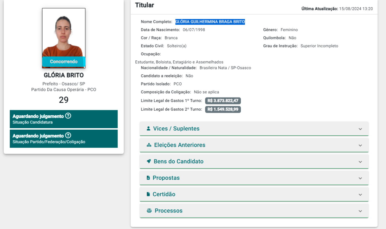 Hoje aconteceu uma surpresa, teremos uma candidatura a prefeito do Partido da Causa Operária (PCO). Será a jovem Glória Guilhermina Braga Brito, 26, a Glória Brito, nascida em Osasco, que irá concorrer a prefeitura de Osasco nas eleições municipais do próximo dia 6 de outubro. O vice da candidata Glória Brito é o também osasquense Bruno Laurentino Sousa Silva, 35, o Bruno Sousa.