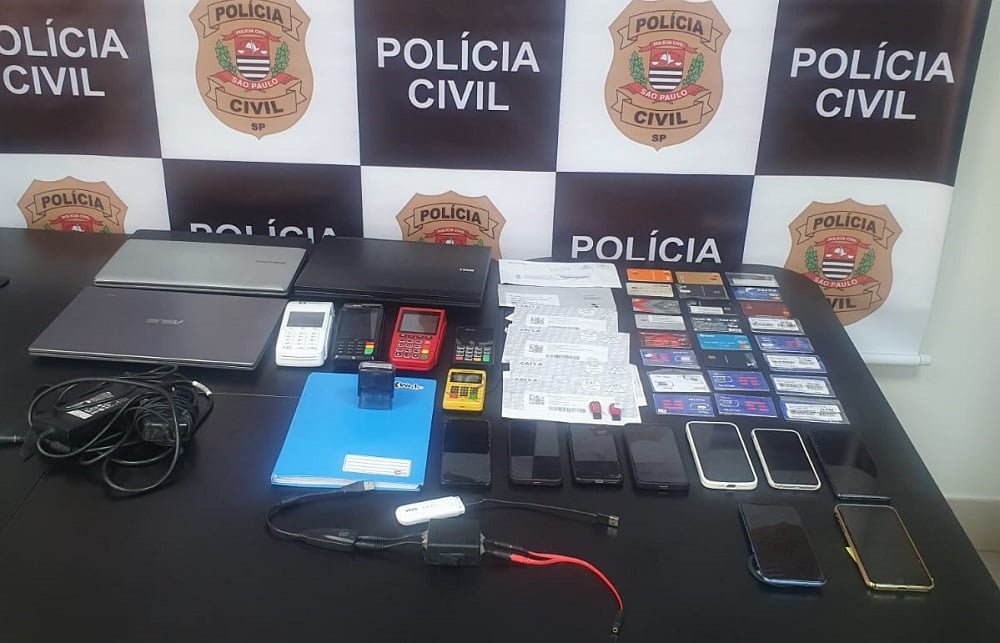 Celulares, máquinas de cartão, notebooks e diversos cartões bancários foram recolhidos e as investigações prosseguem visando a identificar outros envolvidos no esquema.