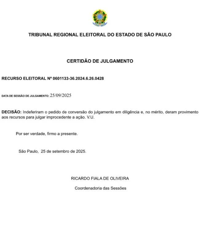 A reversão aconteceu na última quinta-feira (25), durante a sessão de julgamento do recurso nº 0601133-36.2024.6.26.0428, que analisou a anulação motivada por suposta fraude à cota de gênero. O Juiz da primeira instância havia invalidado os votos do PSD por esta alegação, mas o TRE considerou a decisão incorreta e restabeleceu os votos válidos do partido.