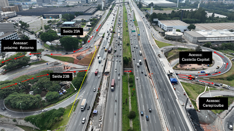 - Km 23+800 – Pista Marginal Oeste (sentido interior): interdição total da alça de saída 23B, próxima a Alphaville;
