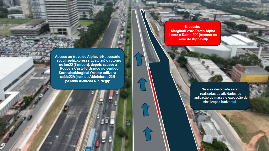 Durante a operação, os motoristas que trafegam pela Castello Branco no sentido São Paulo e desejam acessar Alphaville, Aldeinha ou a Alameda Rio Negro deverão seguir até o km 22, na altura do Tamboré, onde será possível realizar o retorno e acessar normalmente a região.